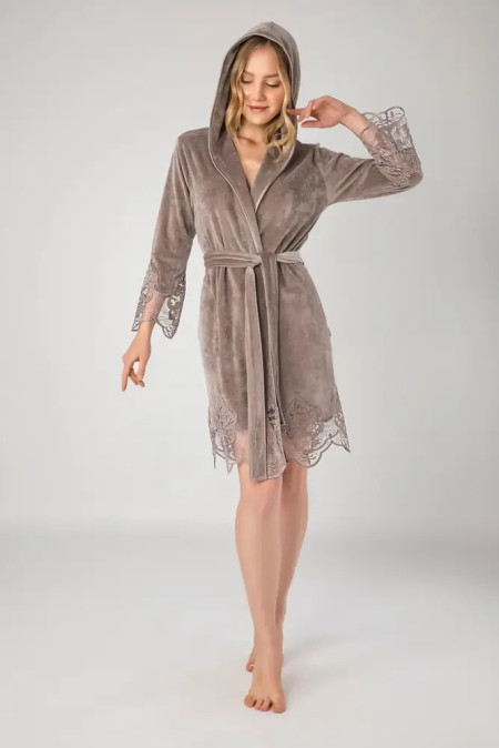 Короткая длина халата делает его идеальным для повседневного использования, а капюшон добавляет практичности и стиля. Удобный пояс позволяет регулировать посадку по фигуре, обеспечивая максимальный комфорт. Модель дополнена функциональными карманами и изящным кружевным декором, что придает изделию особую женственность.